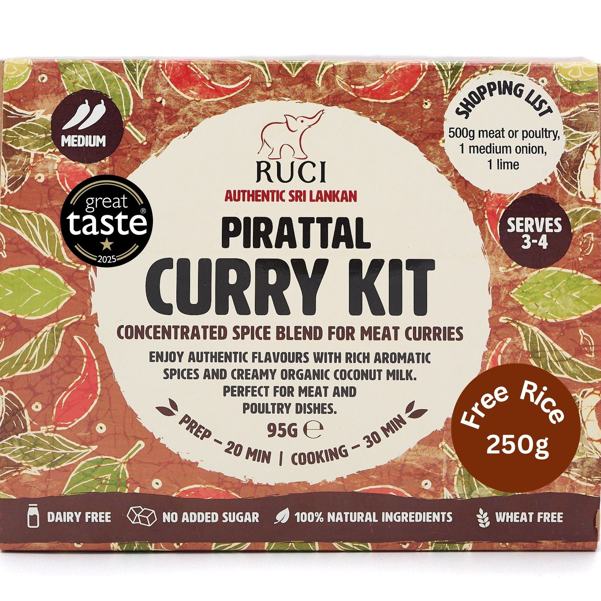 One kit makes a full rice & curry meal for 4 servings. Simply add 500g of meat or poultry and one onion from your kitchen, and follow our easy to follow recipe card to prepare an authentic Sri Lankan feast.