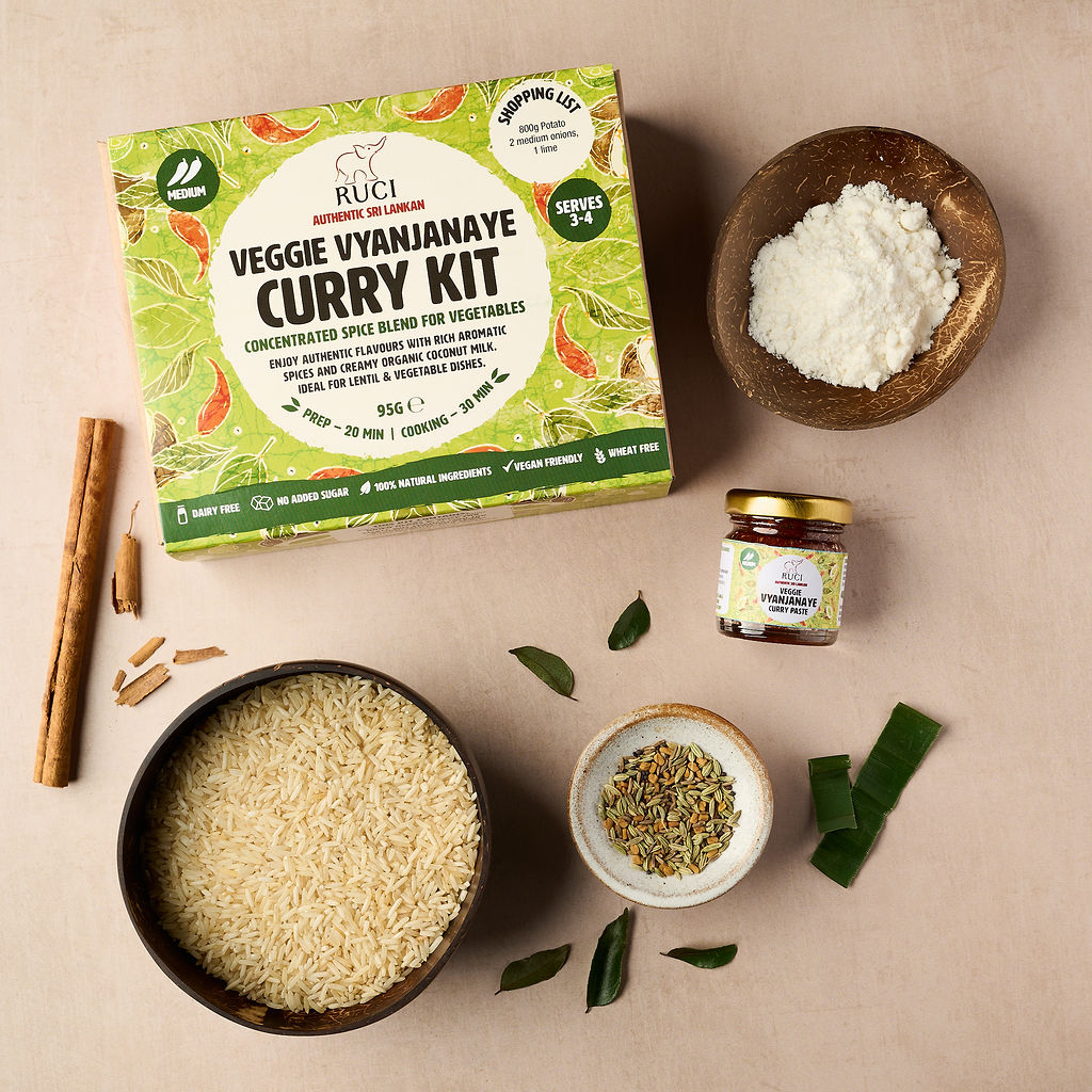 A wholesome Sri Lankan curry kit crafted for vegetables. Complete with spices, curry paste, and coconut milk powder. It’s the simplest way to enjoy an authentic plant-based rice & curry feast at home.